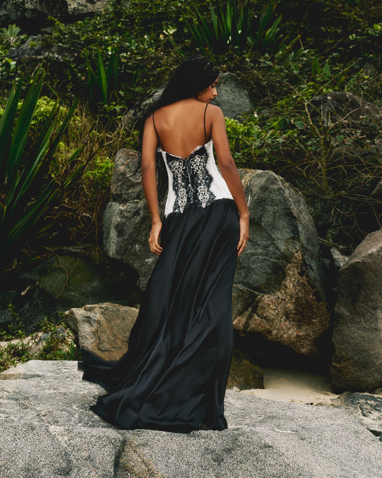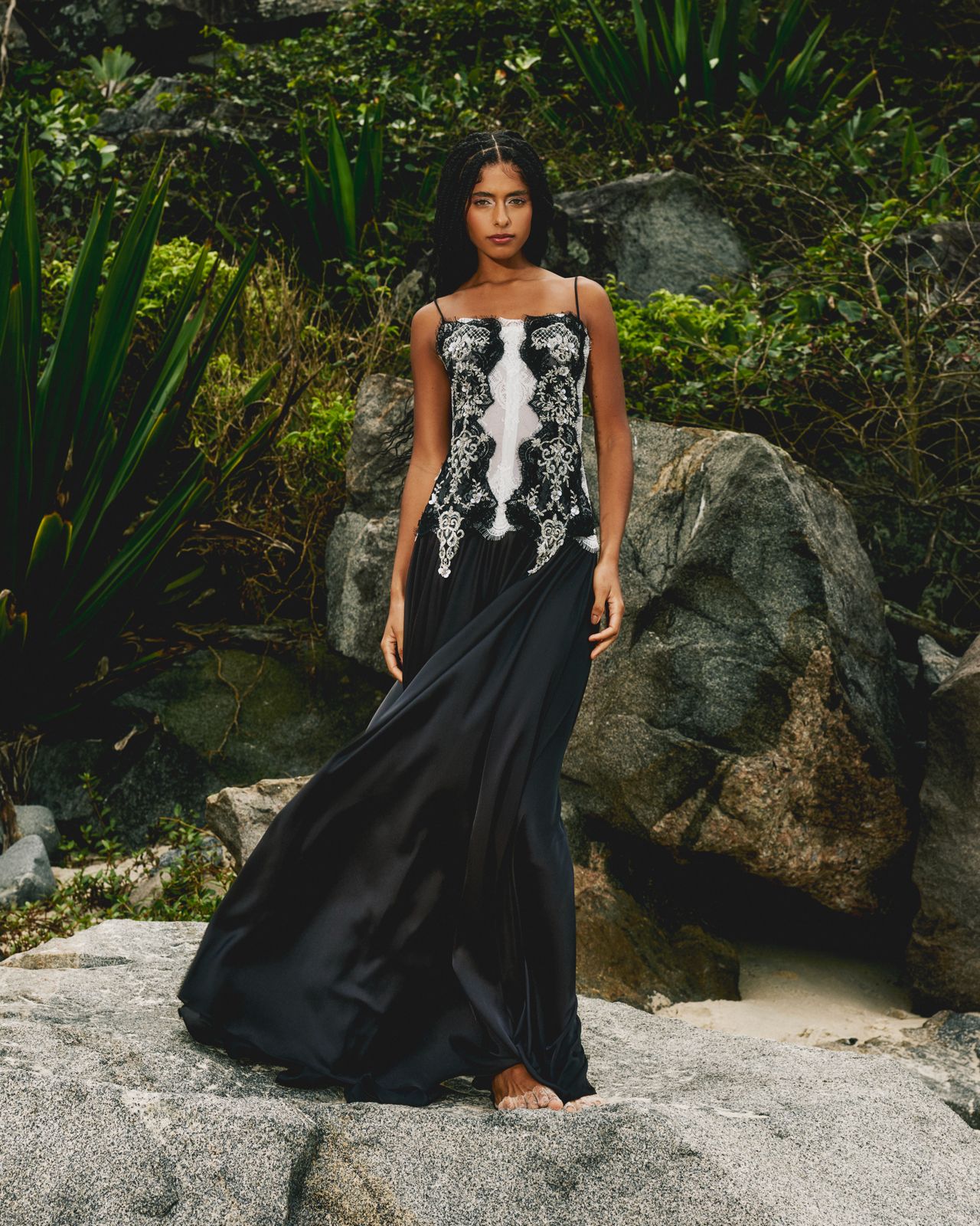 O corpinho recebe detalhes em tule bordado, que acrescentam textura e leveza ao desenho. A saia evasê em cetim leve garante movimento, enquanto as alças finas em rolotê completam a silhueta com delicadeza.